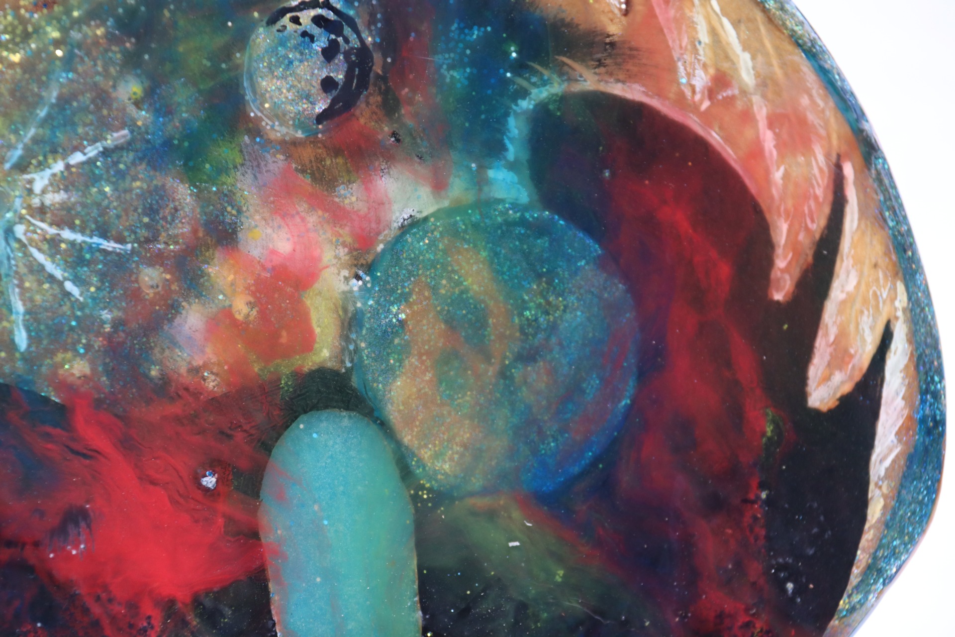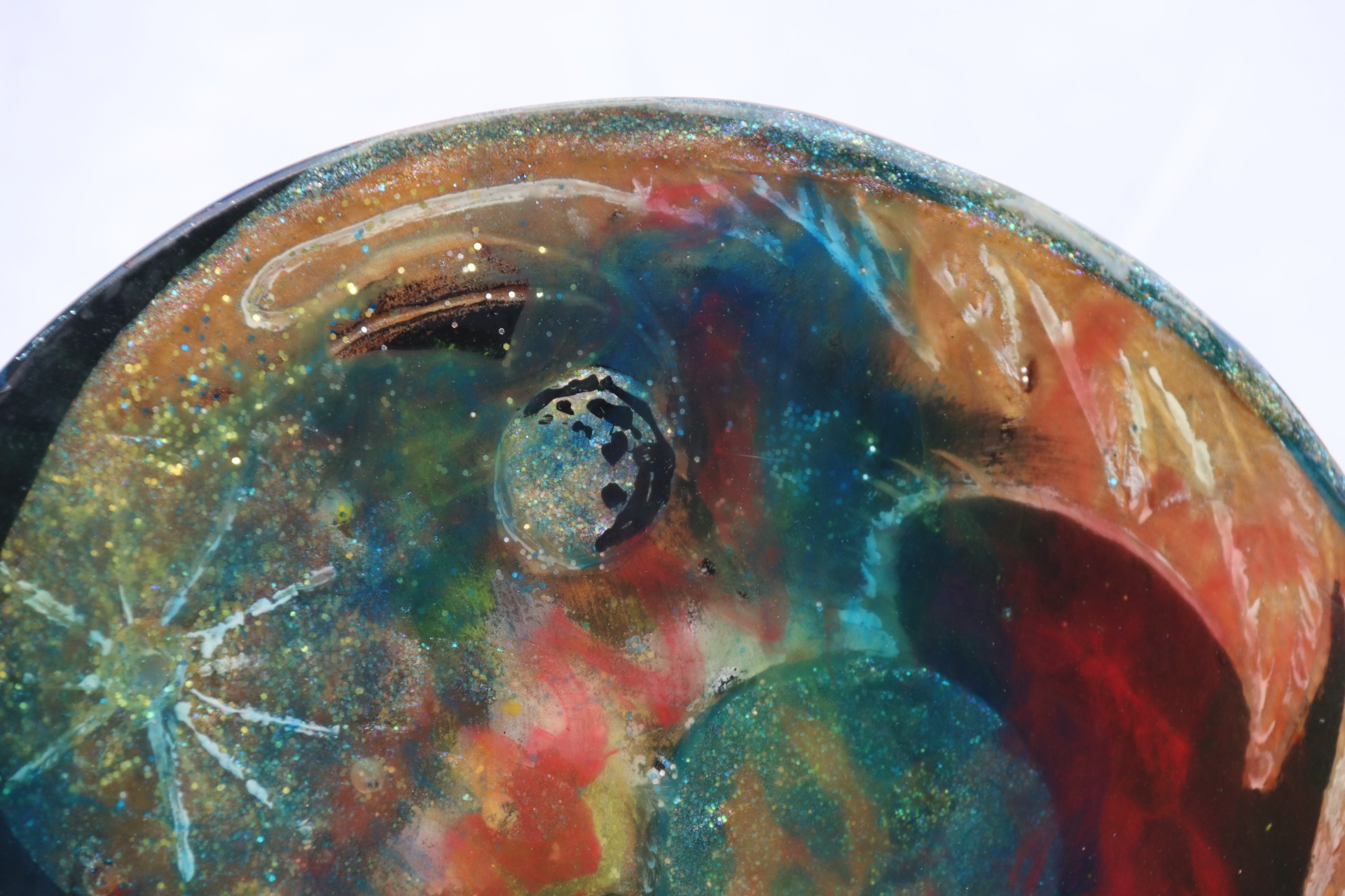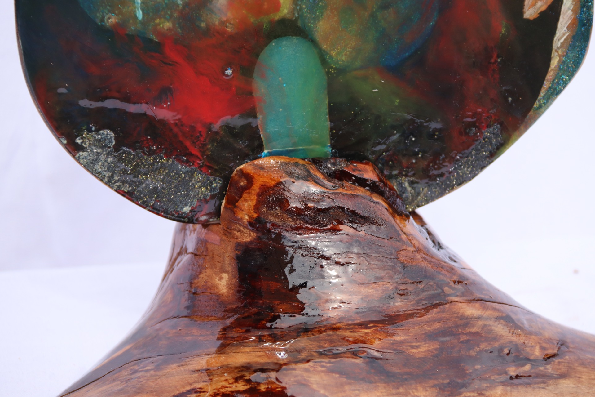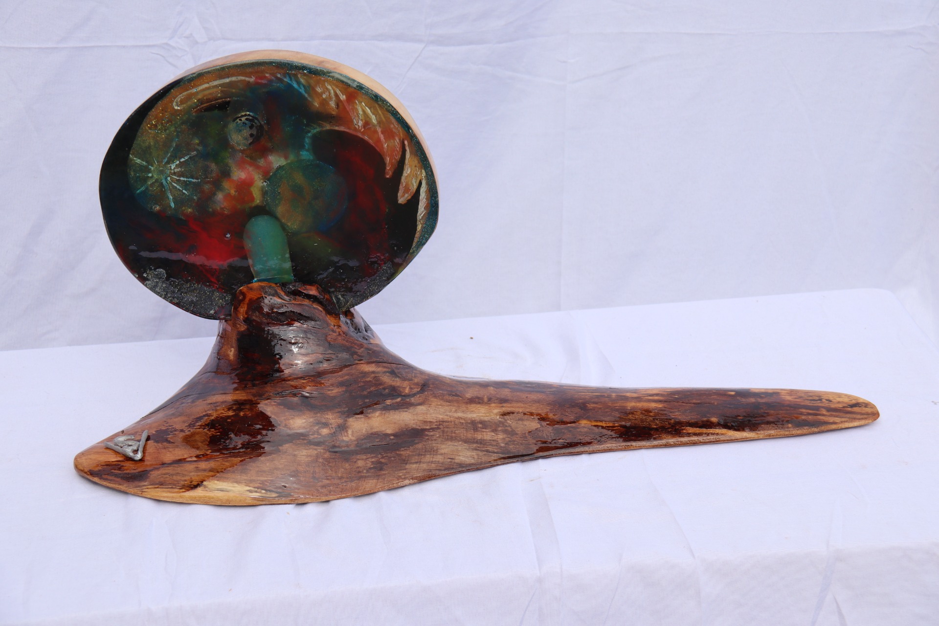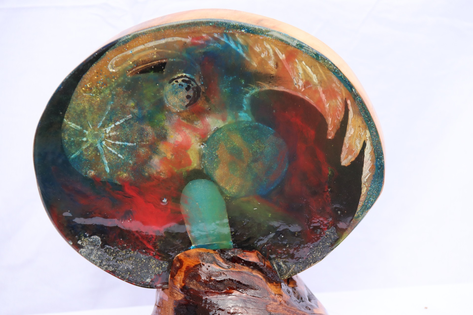Obraz z lité pryskyřice, na lípě, osazeno v bukovém stojanu.