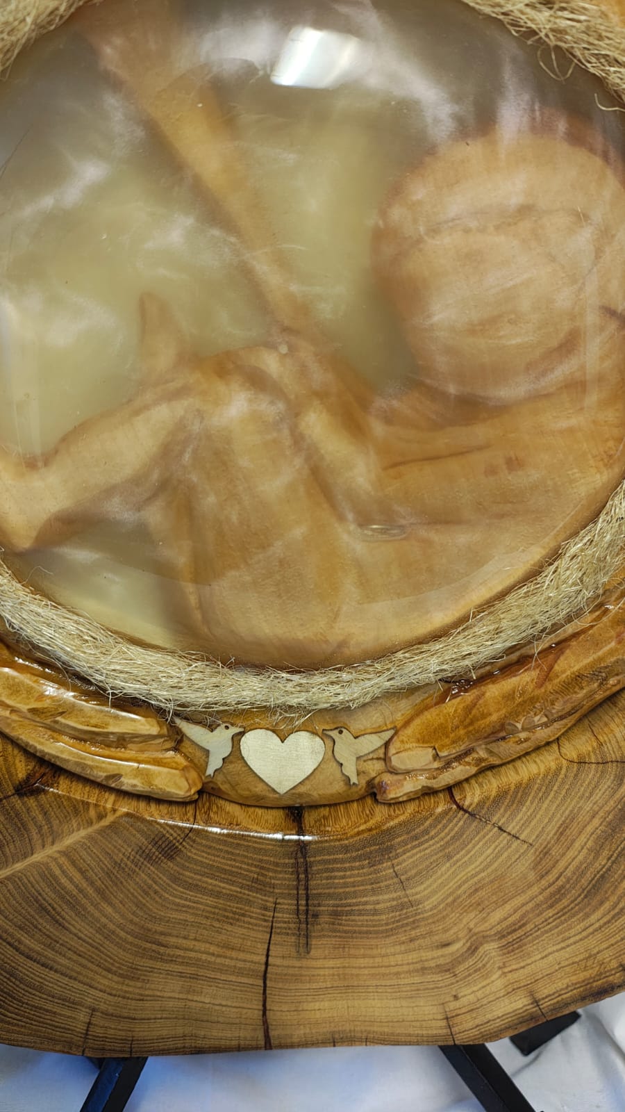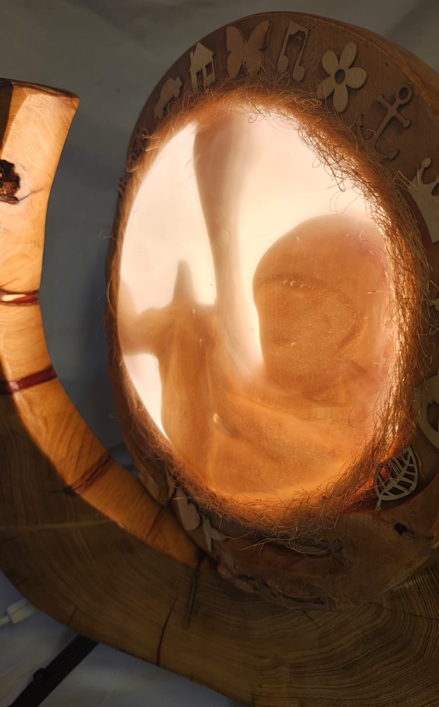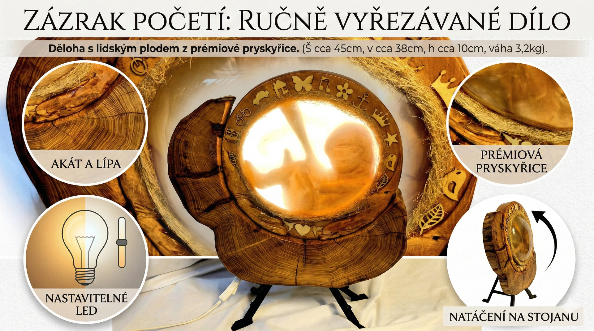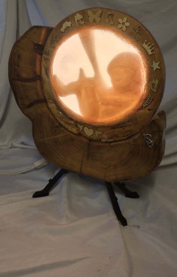 Naším dílkem jsme se snažili ztvárnit lidský plod v děloze a tímto způsobem zobrazit tento lidský zázrak. Dílko je kombinací akátového a lípového dřeva, a bříško, děloha vylita prémiovou pryskyřicí. Vše umocňuje kvalitní LED osvětlení s nastavením čtyř teplot barvy a třech intenzit osvětlení. Plod dítěte je možné ve stojanu, mírně natočit doprava i doleva.