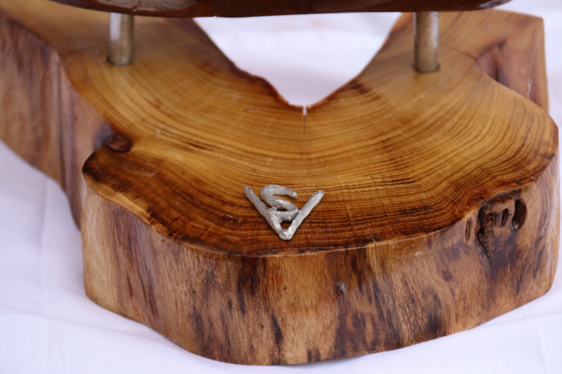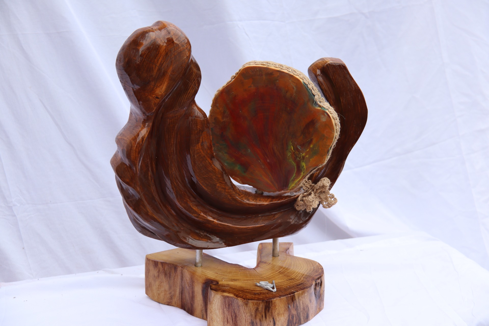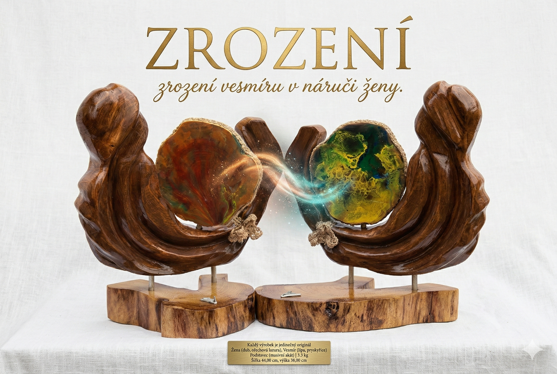 Žena, řezba z dubu tónovaná ořechovou lazurou, vesmír lípa s litou pryskyřicí. Podstavec z masivního akátu.